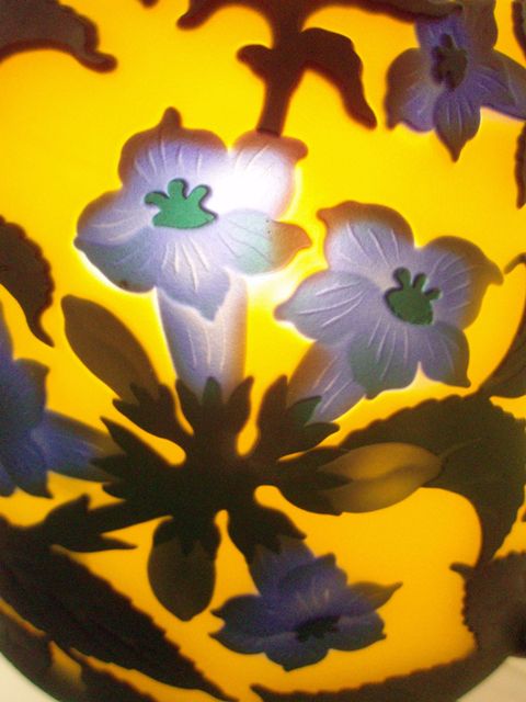 ガラスの色をかためて彫りこんで作っていくガレランプは、ステンドグラスランプに比べ落ち着いた趣の光りが感じられます。