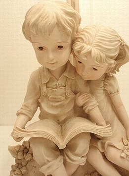男の子と女の子が本を読んでいるデザインのランプです。シェードは薄ピンクで、とても可愛らしい。